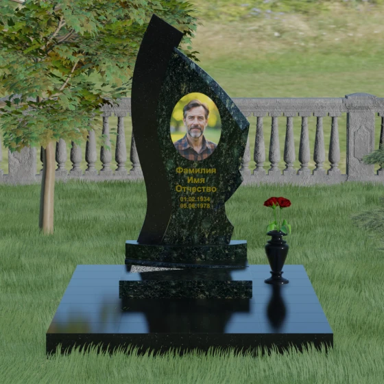 Форма этого памятника глубоко символична. Асимметрия олицетворяет жизненный путь — не всегда ровный, но всегда уникальный. Сочетание двух разных пород камня в одной стеле символизирует неразрывную связь души и тела, земного и вечного. Плавный изгиб верхней кромки напоминает защитное крыло или тихую волну памяти, уносящую печаль, оставляя лишь светлые воспоминания. Этот монумент внушает чувство покоя и защиты, словно оберегая покой ушедшего своей массивной и надежной конструкцией.