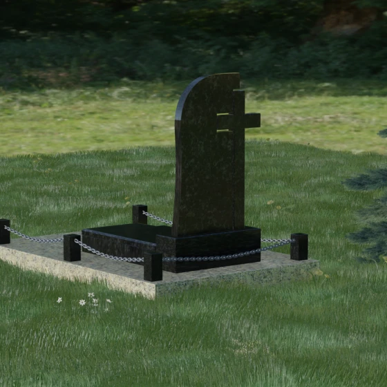 Каждый элемент этого надгробия несет в себе скрытый смысл. Высокий крест, интегрированный в саму структуру камня, выступает символом духовного покровительства и незыблемой веры. Асимметричная форма стелы олицетворяет жизненный путь, который никогда не бывает абсолютно ровным, но всегда стремится вверх, к свету. Массивное основание и каменное ограждение с цепями символизируют крепость семейных уз и нерушимую границу между суетным миром и вечным покоем. Эта форма вызывает чувство защищенности и монументальности, подчеркивая, что память о дорогом человеке так же тверда и вечна, как сам гранит.