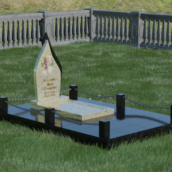 Особое внимание уделено благоустройству прилегающей территории. Мемориальная композиция включает в себя полное мощение участка массивными плитами из натурального камня. Это не только придает захоронению законченный и величественный вид, но и является практичным решением, избавляющим от необходимости постоянной борьбы с сорняками или проседания грунта. Периметр участка обозначен аккуратными каменными столбиками, соединенными декоративными цепями. Такая ограда создает визуальную и сакральную границу, защищая покой усопшего и подчеркивая обособленность места памяти. Каждый элемент — от полированных фасок на цоколе до золотистой гравировки имен — выполнен с ювелирной точностью.