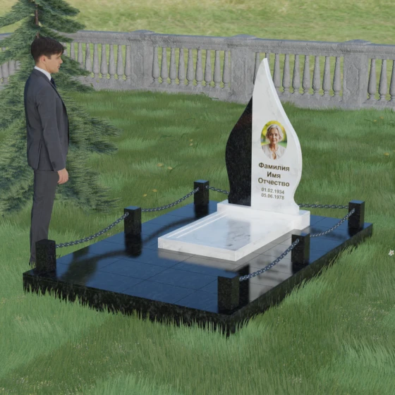 Выбор мемориального изделия — это всегда глубоко личный процесс, стремление выразить в камне ту нежность и уважение, которые мы храним в сердце. Модель 018 воплощает в себе гармонию и завершенность. Величественная стела выполнена в форме изящного, стремящегося ввысь пламени или капли, что символизирует вечный свет души и неугасаемую память. Асимметричная геометрия с мягкими, плавными изгибами лишена острых углов, что подчеркивает идею спокойствия и вечного упокоения. Особое внимание привлекает сочетание двух контрастных видов камня: светлая левая часть стелы с её благородной зернистой фактурой мягко огибает темную зеркальную сердцевину. Этот контраст создает визуальный объем и глубину, подчеркивая уникальность композиции и делая её заметной на фоне традиционных строгих форм.