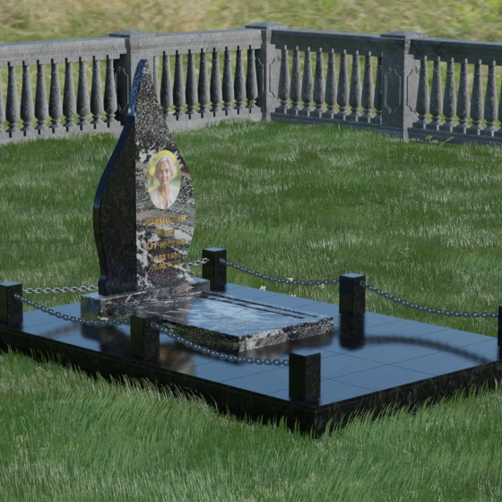 Конструкция модели 018 продумана до мелочей, включая полное благоустройство места захоронения. Монумент устанавливается на массивный двухцветный постамент, который обеспечивает устойчивость всей вертикальной конструкции. Особое внимание уделено обустройству прилегающей территории: вместо открытого грунта используется сплошное мощение плитами из натурального гранита. Это не только придает мемориальному комплексу законченный и достойный вид, но и значительно упрощает уход за ним, исключая появление сорняков и скопление грязи. Периметр участка обозначен строгим и лаконичным ограждением в виде невысоких каменных столбиков-боллардов, соединенных декоративными металлическими цепями. Такая ограда создает приватную зону, не загромождая пространство, и подчеркивает элитарность комплекса.