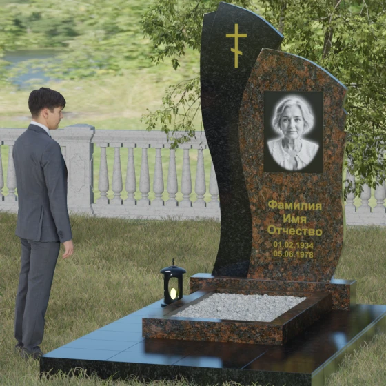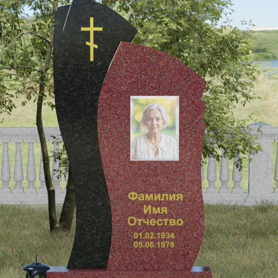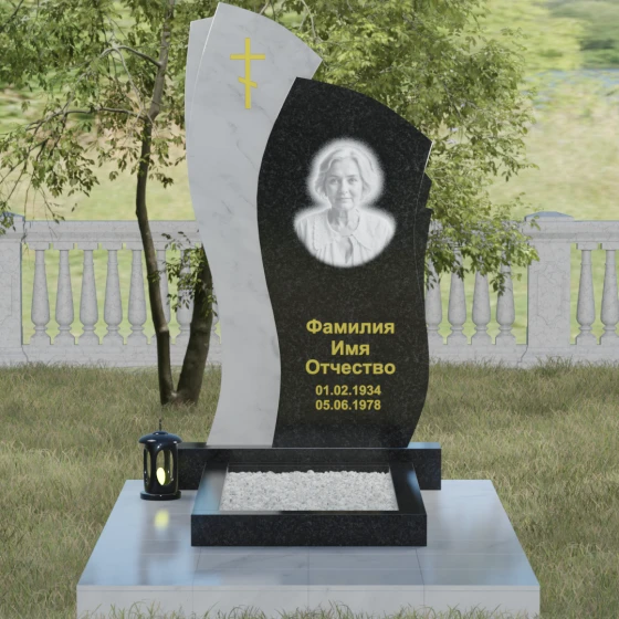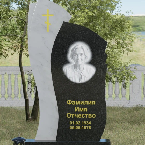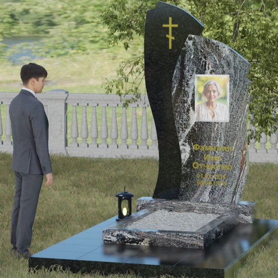 Данное ритуальное изделие представляет собой сложную художественную композицию, в которой мастерски обыгран контраст форм и материалов. В центре внимания — двухсоставная стела, объединяющая в себе мягкость восходящей линии и решительную геометрию скалы. Левый сегмент выполнен в виде изящной, тянущейся к небу волны из светлого камня, на которой лаконично расположился золоченый православный крест. Правая часть, служащая основанием для портрета, притягивает взгляд своей необычной обработкой: её внешний торец выполнен с каскадной, ступенчатой резкой, создающей эффект многослойности и глубины. Такая асимметрия символизирует сложность жизненного пути и возвышенность души.