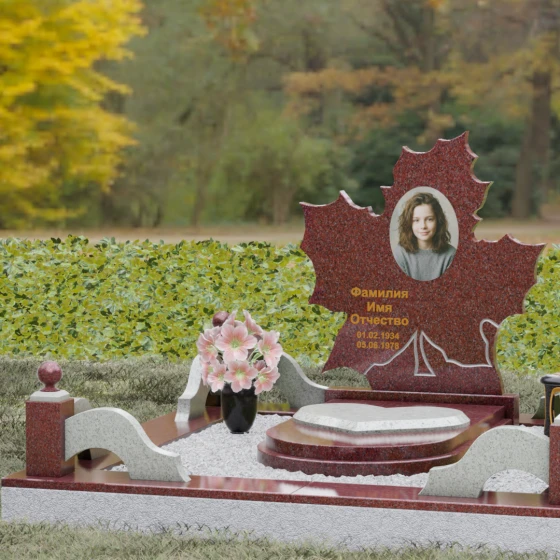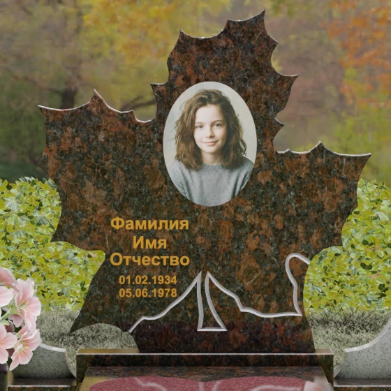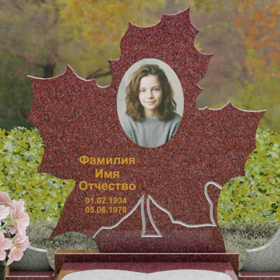 Данная мемориальная композиция — это воплощение глубокого уважения и вечной памяти, облаченное в художественную форму. Выбор формы кленового листа не случаен: в мировой символике он олицетворяет силу духа, красоту жизненного пути и мудрость. Каждая линия этой стелы пропитана эстетикой природного изящества. Резные края листа выполнены с филигранной точностью, создавая сложный, многогранный силуэт, который выделяется на фоне классических строгих форм. Плавные изгибы и отсутствие агрессивных углов призваны дарить чувство покоя и умиротворения, подчеркивая, что душа близкого человека обрела вечный приют в гармонии.