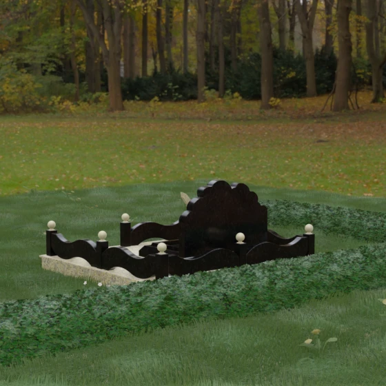 Особое внимание уделено благоустройству участка. Вместо традиционного открытого грунта здесь реализовано полное мощение массивными гранитными плитами. Такое решение не только придает захоронению завершенный и дорогой вид, но и значительно упрощает уход за местом памяти, сохраняя безупречную чистоту в любое время года. Окружающий монумент цоколь выполнен в виде изящных волнообразных панелей, соединенных столбиками с навершиями в форме идеальных каменных шаров. Эти сферы добавляют композиции торжественности и завершенности, подчеркивая элитный статус мемориала.