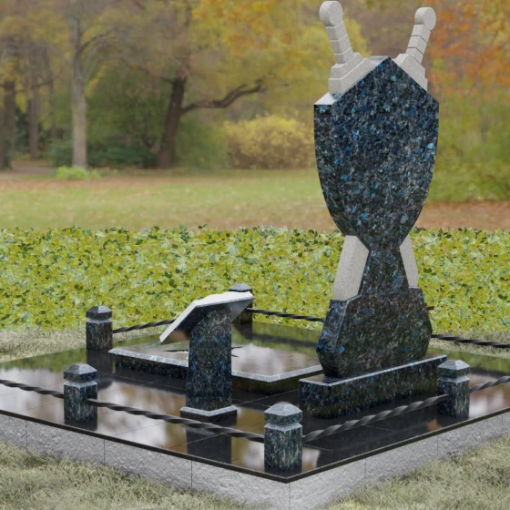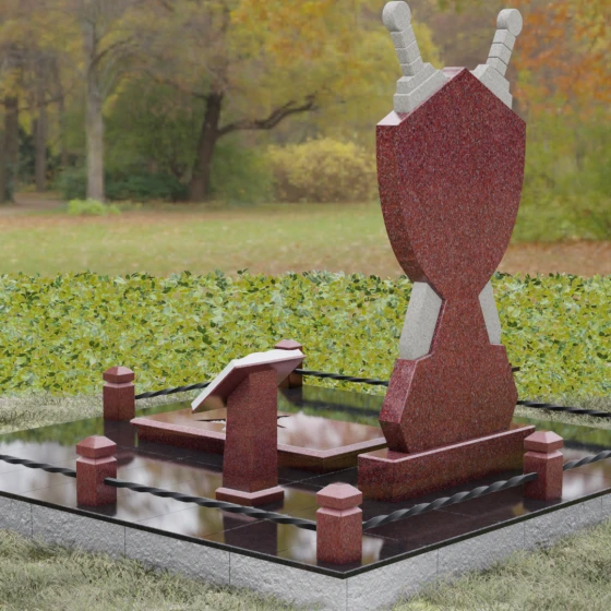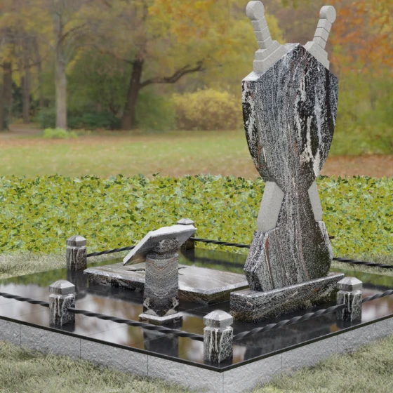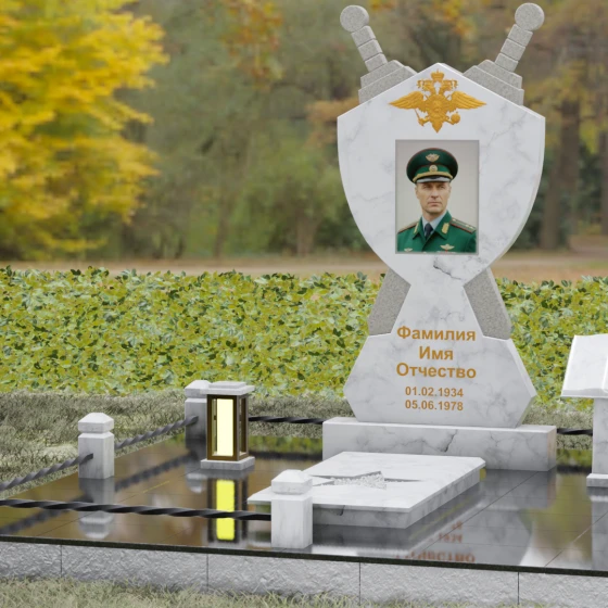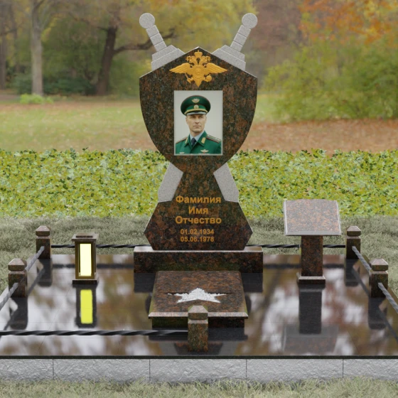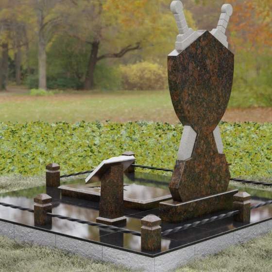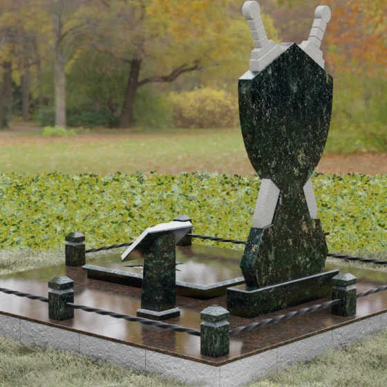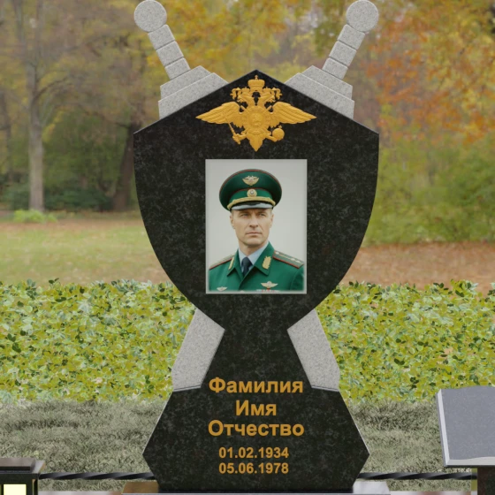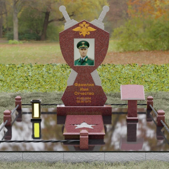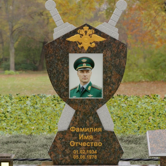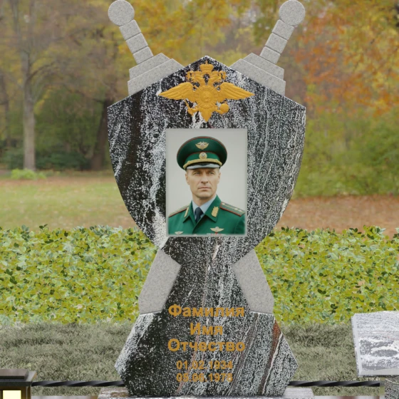 Кому подойдет: Данная мемориальная композиция разработана специально для тех, кто посвятил свою жизнь служению Отечеству. Она станет идеальным выбором для оформления места захоронения профессионального военного, сотрудника правоохранительных органов, ветерана или человека, чья жизнь была примером мужества и дисциплины. Строгие линии, военная символика и монументальность формы без лишних слов расскажут о силе характера, доблести и чести того, кто нашел здесь свой последний приют.