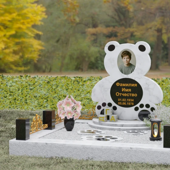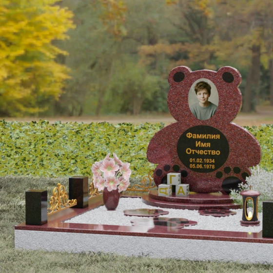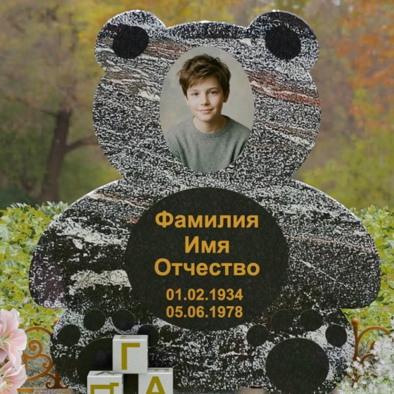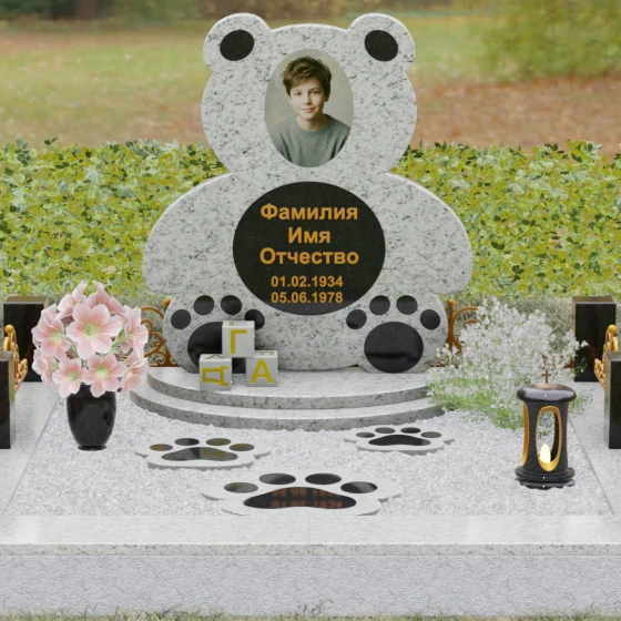 Представленное надгробие из натурального камня (Артикул 235) — это подлинное произведение мемориального искусства, в котором монументальность гранита встречается с трогательной нежностью художественного образа. Силуэт памятника выполнен в форме стилизованной фигуры медвежонка, что мгновенно переводит восприятие из плоскости строгой скорби в область светлых, чистых воспоминаний о невинности и искренности. С точки зрения искусствоведа, выбор такой формы является глубокой аллегорией вечной защиты и неувядающей любви: округлые, мягкие линии стелы лишены острых углов, что символизирует бесконечность и гармонию.
