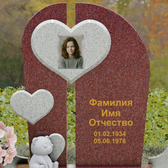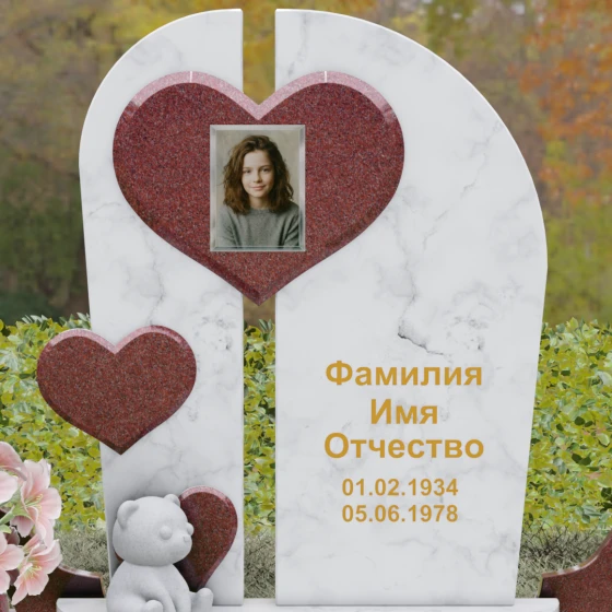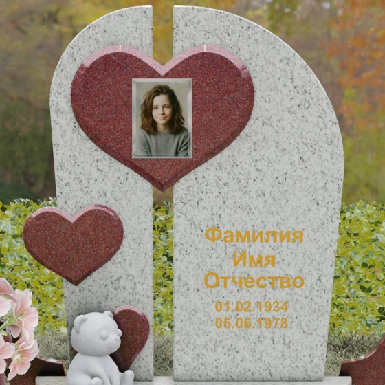 Каждая линия этой модели наполнена глубоким смыслом. Разделенная на две части стела символизирует границу между двумя мирами, а объединяющее их сердце — торжество любви над временем и забвением. Фигура медвежонка у подножия — символ чистоты, беззащитности и невинной души, что часто выбирают для оформления захоронений самых дорогих и рано ушедших близких. Использование контрастных цветов камня подчеркивает многогранность человеческой жизни, где есть место и глубокой скорби, и светлым воспоминаниям. Этот памятник не просто обозначает место покоя, он рассказывает историю глубокой привязанности, которая не исчезает с годами.