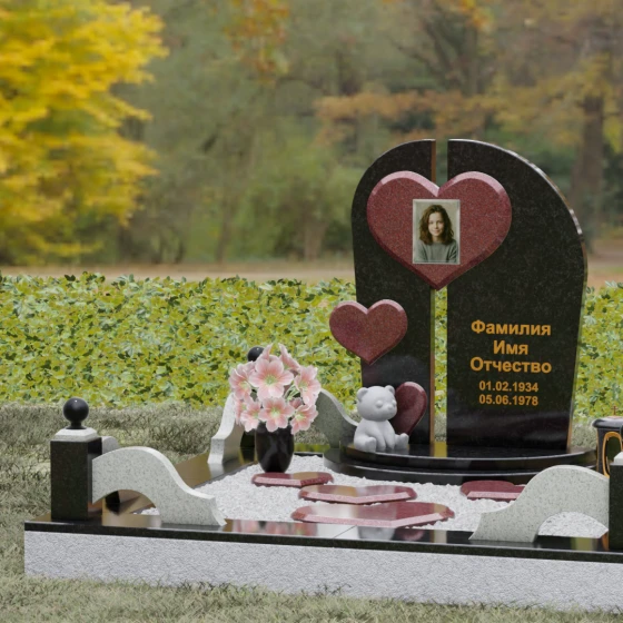 Визуальная концепция модели строится на гармоничном сочетании двух асимметричных вертикальных стел, выполненных из темного камня с безупречной зеркальной полировкой. Центральным элементом композиции является объемное сердце из контрастного красного гранита, которое словно объединяет две половины памятника. В его центре располагается портрет, обрамленный тонкой фаской, что создает эффект драгоценного медальона. Дополнительный акцент вносит второе, меньшее по размеру сердце, закрепленное на левой части стелы, что добавляет динамики и многослойности художественному образу.