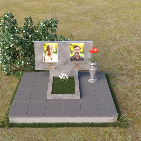 Представленный памятник (артикул ПГ001) являет собой образец строгости и лаконичности, где каждая деталь подчинена общей концепции увековечивания памяти. Композиция состоит из основания, облицованного серыми плитами, горизонтальной плиты, и вертикальной плиты с портретами. Дополнительно предусмотрена тумба для вазы.