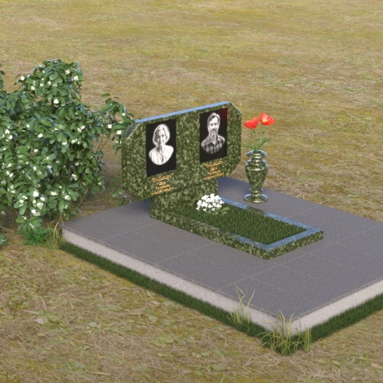 Композиция памятника строится на контрасте строгих геометрических форм и плавных линий, символизирующих жизненный путь и обретение покоя. Стела имеет форму, близкую к прямоугольнику, но с элегантно скошенными углами, смягчающими ее строгость. Верхняя часть стелы имеет две небольшие грани, словно фацеты драгоценного камня, добавляющие ей изысканности. Поверхность камня отполирована до зеркального блеска, что подчеркивает глубину черного цвета и создает ощущение торжественности. На лицевой стороне размещены портреты усопших, выполненные с высокой степенью детализации. Ниже портретов выгравированы надписи, выполненные строгим шрифтом. Справа от стелы установлена небольшая ваза, выполненная в том же стиле, что и памятник, и украшенная простым, но элегантным орнаментом.