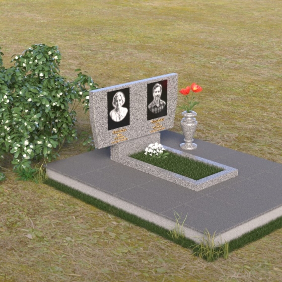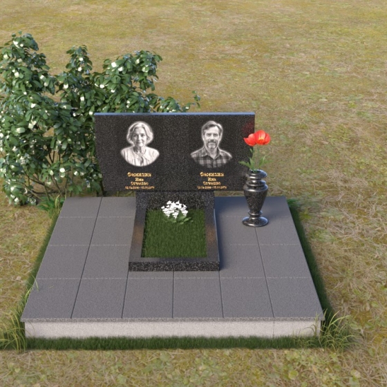 Это ритуальное изделие представляет собой гармоничное сочетание прямых линий и мягких, едва уловимых изгибов, создающих ощущение покоя и умиротворения. Стела имеет прямоугольную форму, но ее верхняя грань слегка скошена, что придает ей визуальную легкость и динамику. Обратите внимание на зеркальную полировку лицевой стороны – она отражает небо и окружающий мир, словно заключая в себе вечность. На полированной поверхности выгравированы портреты усопших и памятные надписи, выполненные с высокой точностью и детализацией. Слева от стелы, на основании, располагается небольшая горизонтальная плита с аналогичной полировкой, создающая дополнительное пространство для цветов или памятных предметов. Основание памятника выполнено из серого камня с матовой фактурой, что создает контраст с блестящей стелой и придает композиции устойчивость и завершенность. Рядом с плитой установлена ваза, выполненная из того же черного полированного гранита, что и стела, что обеспечивает единство стиля и служит достойным обрамлением для живых цветов, символизирующих вечную память.