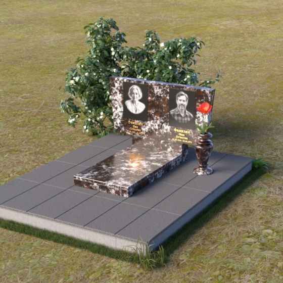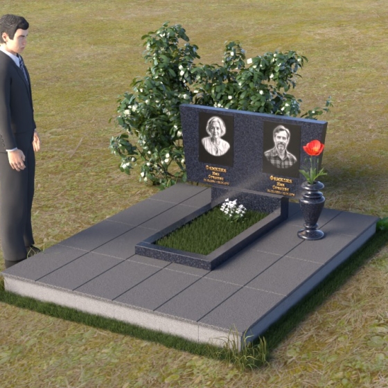 Этот памятник представляет собой изысканную композицию, где строгость линий сочетается с плавными, утонченными деталями. Стела имеет прямоугольную форму с асимметричной верхней гранью. С левой стороны верхний угол плавно скошен вниз, создавая ощущение ниспадающей драпировки или крыла ангела, оберегающего покой усопших. Правый верхний угол стелы остается прямым, что придает конструкции визуальную устойчивость и завершенность. Боковые грани стелы тщательно отполированы, что создает эффект зеркального блеска, отражающего окружающий мир и символизирующего связь между земным и небесным. Под стелой располагается горизонтальная плита меньшего размера, также выполненная в зеркальной полировке, создавая эффект единого целого и усиливая визуальную глубину композиции. Все элементы памятника установлены на широкое основание, облицованное плиткой серого цвета, что обеспечивает устойчивость и долговечность конструкции.
