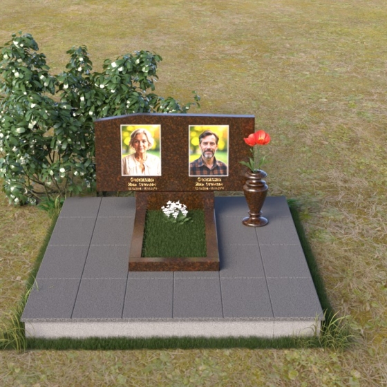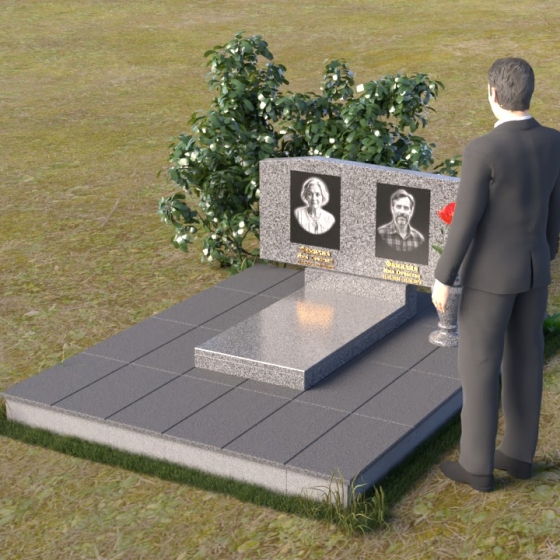 Основным элементом композиции является вертикальная плита, возвышающаяся над прямоугольным основанием. Гранитная плита имеет слегка вогнутую форму верхней грани, что придает ей мягкость и визуально облегчает массивность. На отполированной до зеркального блеска поверхности выгравированы портреты усопших, выполненные с высокой степенью детализации. Под портретами располагаются надписи с именами и датами жизни, выполненные строгим шрифтом. Вся композиция пронизана чувством сдержанности и достоинства, что позволяет сосредоточиться на главном – на памяти о тех, кого больше нет рядом.