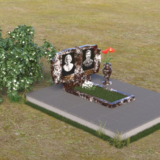 Композиция монумента строится на контрасте плавных линий и строгих геометрических форм. Верхняя часть, несущая на себе портреты усопших, имеет форму, напоминающую раскрытую книгу или свиток, где каждая страница хранит историю жизни. Края этого "свитка" искусно обработаны: верхняя грань словно оплавлена временем, приобретая мягкие, неровные очертания, а боковые стороны имеют более четкий, но все же сглаженный профиль. Фаска, идущая по периметру, придает верхней части визуальную легкость, отделяя ее от основания. Нижняя часть представляет собой прямоугольную плиту с зеркальной полировкой, отражающей небо и окружающий мир, создавая эффект бесконечности и связи с ушедшим. Она словно портал, соединяющий мир живых и мир мертвых, напоминая о непрерывности бытия. Боковины плиты имеют четкую геометрию, подчеркивая основательность и незыблемость памяти.
