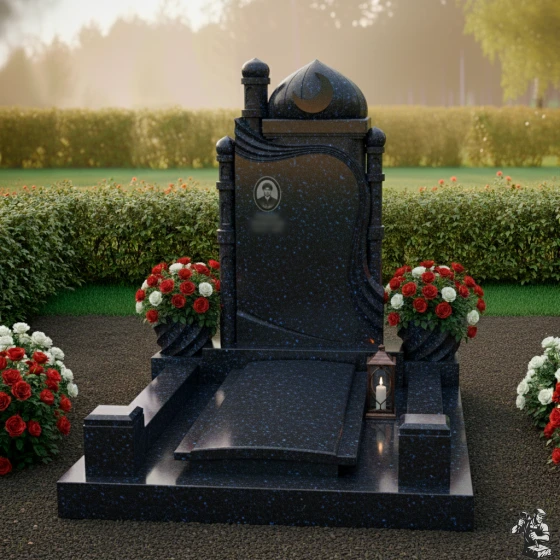 Модель ПН 088 — это не просто мемориальная плита, а подлинное произведение искусства, воплощающее в себе глубокую символику и эстетику восточной архитектуры. Центральная стела, выполненная в глубоком черном цвете, словно портал в мир воспоминаний, обрамлена изящными резными элементами. Ее форма напоминает величественную арку, увенчанную куполом мечети и полумесяцем со звездой — древними символами веры и духовности. Эти элементы выполнены с потрясающей детализацией: каждый изгиб купола, каждая грань минарета, каждый луч звезды проработан до совершенства, создавая ощущение легкости и воздушности, несмотря на монолитность камня. Изящная драпировка, струящаяся по бокам стелы, придает композиции динамичность и мягкость, символизируя скорбь и умиротворение. Контраст между зеркальной полировкой основной черной плиты, на которой будет сиять портрет и имя, и деликатной, чуть шероховатой фактурой светлых резных элементов, создает глубокий визуальный эффект, подчеркивая монументальность и изысканность. Этот контраст играет на свету, меняя оттенки и глубину, что делает монумент живым и многогранным.