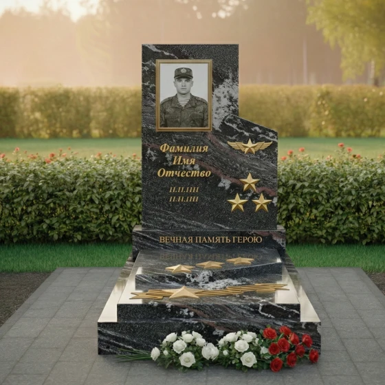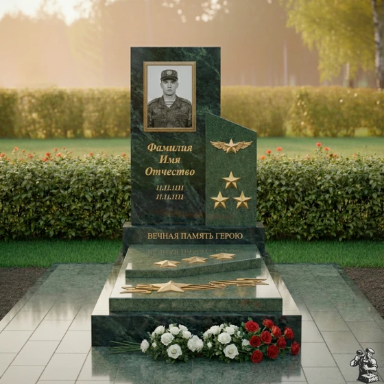 Особое внимание привлекает правая часть композиции, где изящно вырезан фрагмент, напоминающий развевающееся знамя или взлетающую птицу, словно символизируя вознесение души. Эта часть выполнена из камня с глубоким, насыщенным зеленым оттенком и имеет матовую, шероховатую фактуру, создающую благородный контраст с полированной чернотой. На ней расположены три объемные золотые звезды, символизирующие воинскую доблесть и заслуги, а также пара изящных, рельефных крыльев, будто готовых взмыть в небо. Эти элементы выполнены с потрясающей детализацией, каждый изгиб и линия проработаны с ювелирной точностью, придавая монументу особую выразительность и значимость.