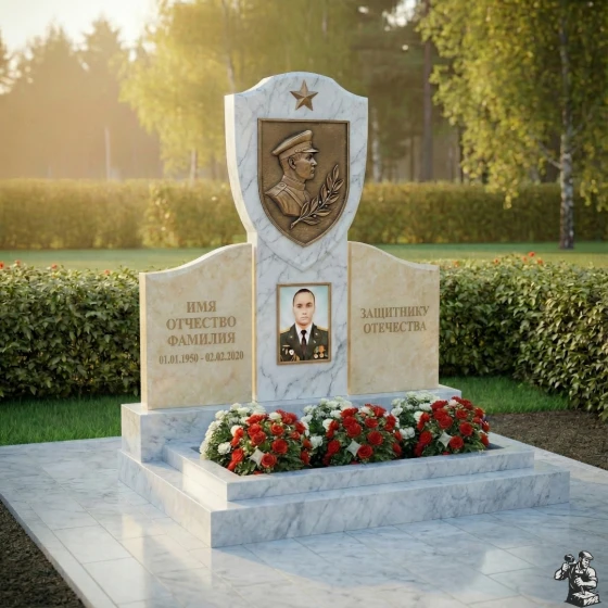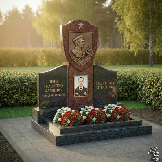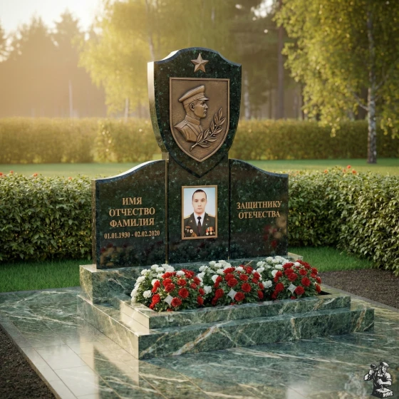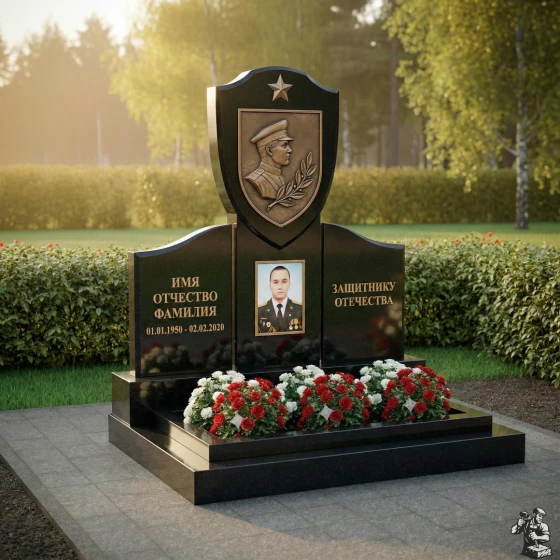 Центральное место в композиции занимает верхняя часть стелы, выполненная в форме геральдического щита, увенчанного пятиконечной звездой — символом воинской доблести и славы. На щите расположен объемный бронзовый барельеф, изображающий профиль мужчины в военной форме, окруженный лавровой ветвью — традиционным знаком победы и мира. Этот элемент придает монументу особую торжественность и подчеркивает героический характер личности. Под щитом, на основной части стелы, расположена глубокая ниша, предназначенная для портрета, который словно вписан в камень, становясь его неотъемлемой частью. Текст «ИМЯ ОТЧЕСТВО ФАМИЛИЯ» и даты жизни выполнены четким, строгим шрифтом, а справа расположена надпись «ЗАЩИТНИКУ ОТЕЧЕСТВА», выгравированная с особым почтением. Контраст между идеально отполированной черной поверхностью камня и матовыми, глубоко выгравированными элементами создает динамичное визуальное восприятие, подчеркивая значимость каждой детали.
