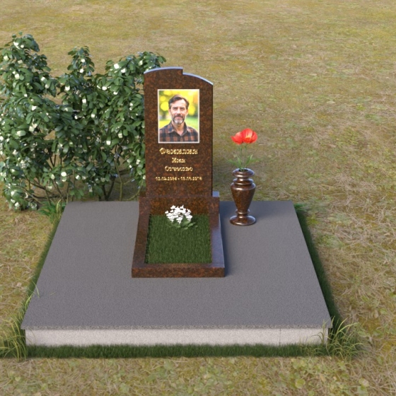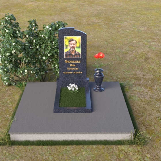Величественная стела ПВ 013 – это монумент, в котором гармонично сочетаются строгость форм и изящество линий. Верхняя часть стелы имеет мягкий, плавно изогнутый контур, словно склоненная в вечной скорби голова. Небольшие сколы по углам придают изделию некую брутальность, подчеркивая незыблемость камня. На лицевой стороне выгравирован портрет усопшего, а также надпись, выполненная строгим шрифтом. Золотистый оттенок букв контрастирует с темным камнем, делая информацию легко читаемой и запоминающейся. Нижняя часть стелы – это прямоугольная опора, переходящая в горизонтальную плиту, создавая ощущение стабильности и надежности.