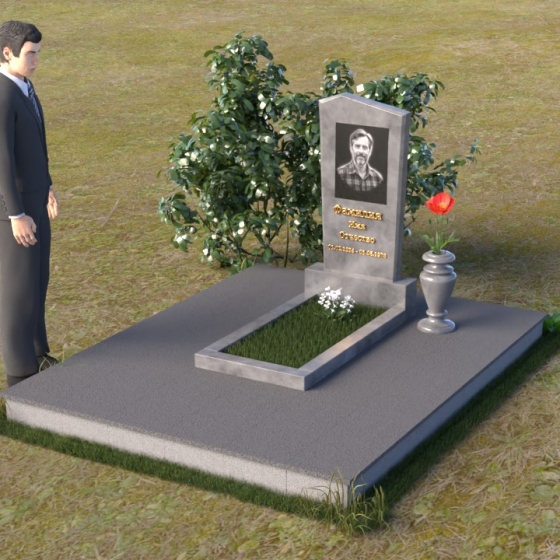 Этот гранитный монумент представляет собой композицию из двух основных элементов: вертикальной плиты с портретом и горизонтальной накладки. Вертикальная плита, возвышающаяся над землей, имеет строгую прямоугольную форму с небольшим скосом в верхней части. Это придает монументу сдержанную элегантность. Зеркальная полировка поверхности отражает свет, создавая ощущение глубины и сияния. На плите выгравирован портрет усопшего, выполненный с высокой точностью и вниманием к деталям. Ниже портрета располагается надпись с именем и датами жизни, выполненная золотым шрифтом. Горизонтальная накладка, расположенная в нижней части, также выполнена из черного полированного гранита и служит своеобразным пьедесталом для вертикальной плиты. Ее гладкая поверхность создает дополнительный контраст с окружающей средой. Рядом с монументом установлена ваза из черного гранита, предназначенная для живых цветов.