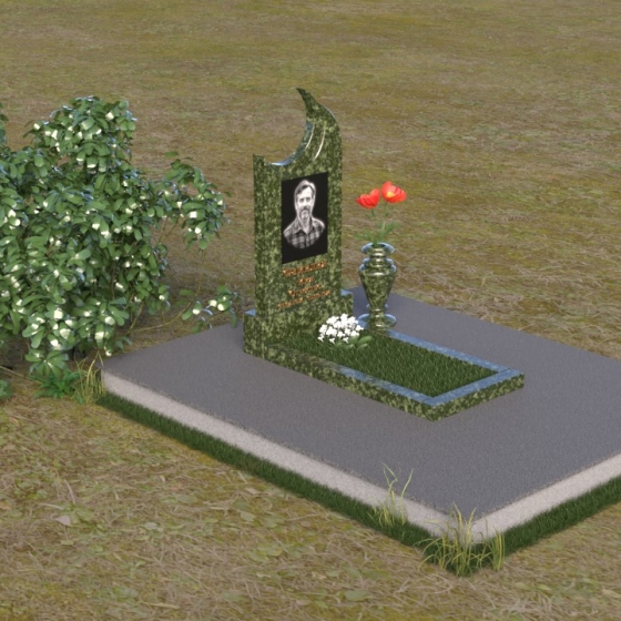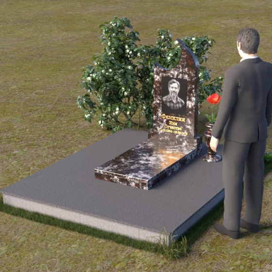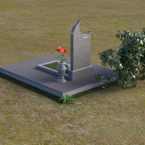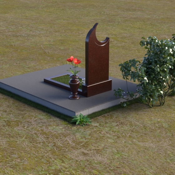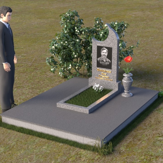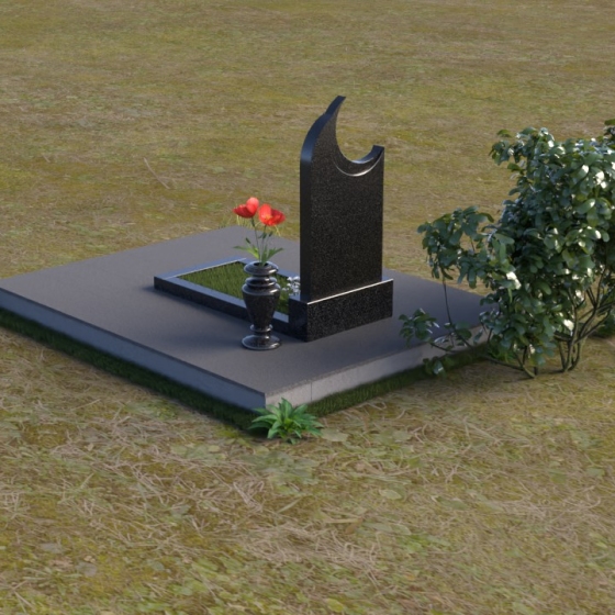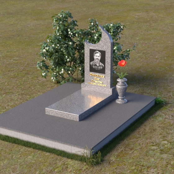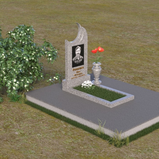 Этот гранитный монумент притягивает взгляд своей необычной формой. Основной элемент – вертикальная плита, увенчанная плавной, асимметричной дугой, напоминающей полумесяц. Её левая сторона чуть выше правой, что создает ощущение динамики и незавершенности, словно оборвавшейся жизни. Поверхность лицевой стороны отполирована до зеркального блеска, отражая небо и окружающий пейзаж, создавая иллюзию глубины и пространства. На полированной поверхности выгравирован портрет усопшего, надпись с именем и датами жизни. Нижняя часть монумента, сопрягаясь с горизонтальной плитой, образует единый ансамбль. Переход между вертикальной и горизонтальной плоскостями подчеркнут небольшой ступенькой, добавляющей конструкции объема. Горизонтальная плита, в свою очередь, также отполирована до блеска, отражая свет и усиливая эффект монументальности. Фаски на гранях плиты аккуратно обработаны, что придает памятнику завершенный и элегантный вид. Сбоку от монумента расположена небольшая гранитная ваза, предназначенная для живых цветов, которые станут символом вечной памяти и любви.