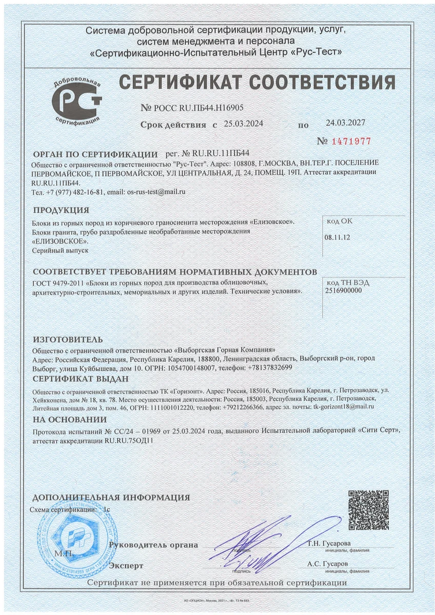Мы хотим, чтобы вы были абсолютно уверены в качестве и безопасности материала, из которого будет изготовлен памятник для ваших близких. Поэтому мы публикуем сертификаты соответствия на основные виды гранита, которые мы используем в работе.