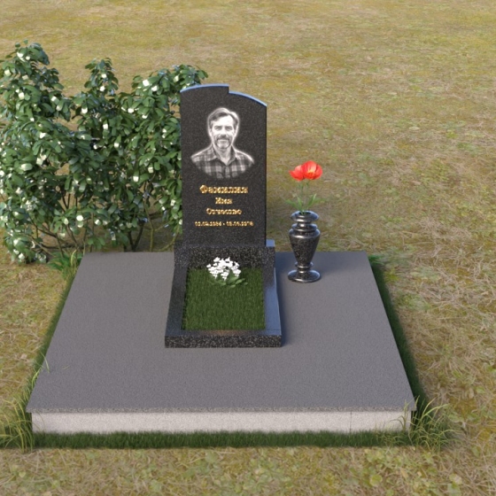 Величественная стела ПВ 013 – это монумент, в котором гармонично сочетаются строгость форм и изящество линий. Верхняя часть стелы имеет мягкий, плавно изогнутый контур, словно склоненная в вечной скорби голова. Небольшие сколы по углам придают изделию некую брутальность, подчеркивая незыблемость камня. На лицевой стороне выгравирован портрет усопшего, а также надпись, выполненная строгим шрифтом. Золотистый оттенок букв контрастирует с темным камнем, делая информацию легко читаемой и запоминающейся. Нижняя часть стелы – это прямоугольная опора, переходящая в горизонтальную плиту, создавая ощущение стабильности и надежности.