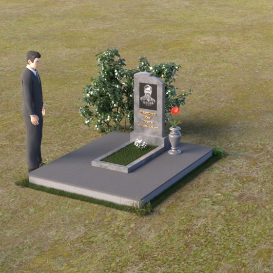 Геометрия модели продумана до мельчайших деталей. Начиная с основания, мы видим широкую плиту, обеспечивающую устойчивость всей конструкции. На ней возвышается горизонтальная плита меньшего размера, выполненная в зеркальной полировке, отражающая небо и окружающий мир, словно запечатлевая в себе мгновения жизни. Вертикальная стела, возвышающаяся над плитой, имеет сглаженные углы и плавные переходы, смягчающие строгость формы. Верхняя часть стелы, с ее деликатными сколами, придает ей уникальность и неповторимость. Рядом со стелой располагается небольшая ваза, выполненная в том же стиле, предназначенная для живых цветов, символизирующих вечную память и любовь.